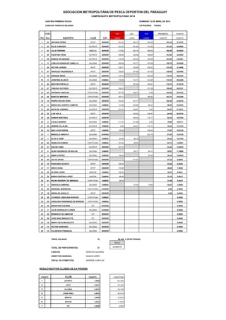 Este documento presenta los resultados del Campeonato Metropolitano de Pesca Deportiva del año 2014 en Paraguay. En la primera fecha, el Club Guyrati Amigos de San Lorenzo obtuvo el primer puesto acumulando 14 puntos, mientras que la Asociación Paraguaya de Caza y Pesca quedó en segundo lugar con 11 puntos. A nivel individual, Faustino Vera del Club Guyrati fue el ganador de la primera fecha con 37 puntos. El documento incluye también los resultados de la segunda fecha y la tabla de posiciones acumulada.