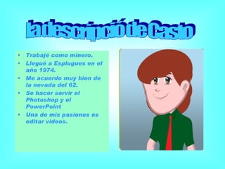 El documento describe la vida laboral y experiencias personales de una persona. Habla sobre su trabajo como minero, su mudanza a Esplugues en 1974 y sus recuerdos de una nevada en 1962. También menciona sus habilidades con Photoshop, PowerPoint y edición de videos. Incluye varias fotos que muestran a la persona a diferentes edades y actividades a lo largo de su vida.