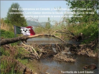 El documento describe las luchas de poder entre diferentes bandas de castores que controlan territorios en Canadá. Lord Cástor domina la banda más temeraria en el norte, mientras que Castor Control controla otros dominios. Los dos bandos se preparan para la batalla por el control de más territorio. Otra banda del noreste entra en conflicto con Castor Control y finalmente pactan una alianza para atacarlos juntos.