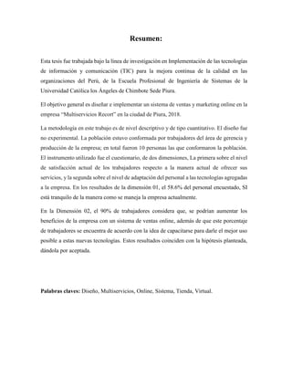 Este documento resume una tesis que tuvo como objetivo diseñar e implementar un sistema de ventas y marketing online para la empresa Multiservicios Recort. Se aplicaron cuestionarios a los empleados para medir su nivel de satisfacción con el sistema actual y su nivel de adaptación a las nuevas tecnologías. Los resultados mostraron que el 58.6% está satisfecho con el sistema actual, mientras que el 90% cree que un sistema de ventas online aumentaría los beneficios y están de acuerdo con capacitarse para usar las nuevas tecnologías.