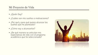 Jhon Alexander Castro presenta su proyecto de vida en el que describe sus sueños y metas. Sus objetivos incluyen convertirse en un profesional exitoso para brindarle lo mejor a su familia y hacerlos sentir orgullosos. Planea alcanzar sus sueños a través de la perseverancia, la dedicación constante a sus estudios y manteniendo una mentalidad positiva. Su programa académico de licenciatura en ciencias naturales se alinea con sus expectativas de vida al permitirle ampliar sus conocimientos sobre temas que le apasionan y enseñar a otros