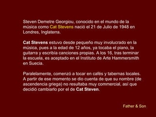 Cat Stevens, cuyo nombre real es Steven Demetre Georgiou, fue un cantautor británico que alcanzó la fama en la década de 1970 con éxitos como "Father and Son", "Wild World" y "Peace Train". En 1977 se convirtió al Islam y cambió su nombre a Yusuf Islam, abandonando su carrera musical para dedicarse a obras filantrópicas. Regresó a la música en los años 2000 con álbumes centrados en promover el Islam.