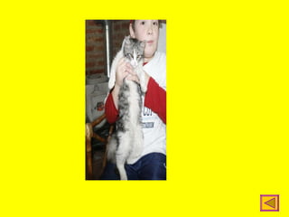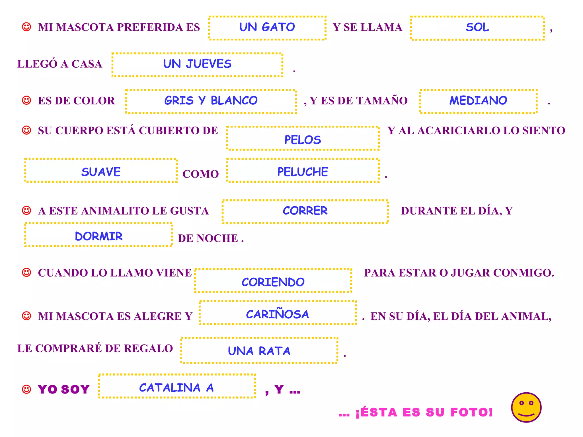 Catalina recibió un gato gris y blanco de tamaño mediano como mascota. Le gusta acariciar a su cariñoso y juguetón gato, que duerme durante el día y juega por la noche, viniendo cuando es llamado.