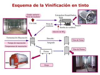 Este documento describe los procesos y factores involucrados en la vinificación en tinto. Explica cómo la duración de la maceración, la temperatura, el remontado, el bazuqueo y la variedad de uva influyen en la extracción de compuestos fenólicos. También compara cómo estas variables afectan la vinificación de variedades como el Cabernet Sauvignon, la Garnacha y el Merlot.