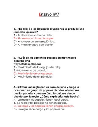 Este documento contiene 26 preguntas de opción múltiple sobre diversos temas de ciencias como química, biología y física. Las preguntas abarcan conceptos como reacciones químicas, movimiento, electricidad estática, cadenas tróficas, desarrollo embrionario humano, evolución, fuerzas y más.