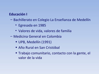 Este documento resume la educación y experiencia profesional de Catalina Lopez-Correa. Obtuvo su título de medicina general en Colombia y realizó posgrados en genética humana en Francia y Bélgica. Trabajó en bioinformática en Inglaterra e Islandia, y luego en Eli Lilly en los Estados Unidos en farmacogenómica. Más recientemente, ocupó un puesto de alta responsabilidad en Genoma Quebec en Canadá. A lo largo de su carrera, ha trabajado en diversos países y culturas mientras se cent