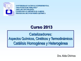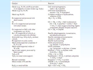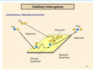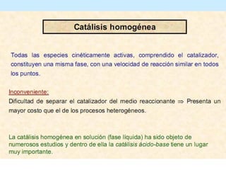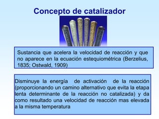 Este documento trata sobre los conceptos básicos de la catálisis, incluyendo definiciones de catalizador, tipos de catalizadores (homogéneos y heterogéneos), propiedades de los catalizadores, mecanismos de reacción catalítica, y tipos de catálisis como la catálisis ácida, básica, enzimática y heterogénea. También discute conceptos como la energía de activación, ecuación de Arrhenius, y ejemplos de reacciones catalizadas como la descomposición del per