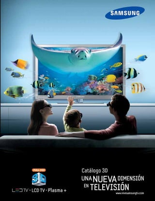 El documento presenta la tecnología 3D de Samsung, describiendo que sus televisores de LED, LCD y plasma pueden proyectar imágenes en 3D de alta calidad. Explica que cuentan con un procesador que convierte imágenes 2D a 3D presionando un botón, y no se requiere un transmisor 3D adicional. Resalta las ventajas de la tecnología de conversión 2D a 3D de Samsung sobre la competencia.