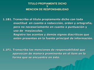 Este documento presenta las reglas generales para la descripción bibliográfica utilizando las Reglas de Catalogación Angloamericanas (RCAA2). Explica cómo transcribir el título, las menciones de responsabilidad, otra información sobre el título como subtítulos, y cómo formular títulos uniformes, títulos colectivos y títulos paralelos en otros idiomas. Incluye ejemplos para ilustrar cada tipo de elemento bibliográfico.