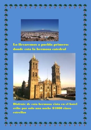 El documento presenta varias opciones de lugares para visitar en México con la familia, incluyendo Puebla, Acapulco, Sonora y Oaxaca. Describe brevemente cada lugar y recomienda hoteles específicos para hospedarse.