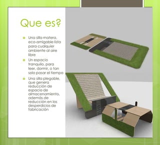 Este documento presenta el diseño de una silla plegable ecológica llamada "Bio_chair" para uso en exteriores. La silla es ligera, plegable para reducir el espacio de almacenamiento y los desperdicios, y se puede usar para leer, dormir u otras actividades al aire libre. El diseño fue validado a través de una maqueta para probar su funcionalidad y comodidad.