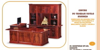 El documento presenta el catálogo de productos de Wonder Desk, una empresa dedicada a la fabricación y venta de mobiliario de oficina hecho de madera, metal y acero inoxidable. Se ofrecen escritorios, muebles, estanterías y racks para oficinas, centros de trabajo, secretarias, ejecutivos y recepciones, con diferentes estilos y materiales.