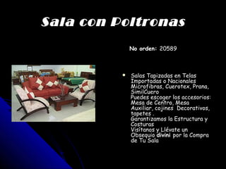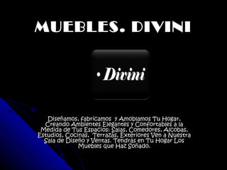 Este documento promociona los servicios de muebles y diseño de interiores de Divini. Divini diseña, fabrica y amuebla hogares con muebles elegantes y cómodos a medida para salas, comedores, dormitorios, cocinas y exteriores. Ofrece muebles modulares, centros de entretenimiento, salas para terraza y jardín, y alcobas con estilos elegantes. Los clientes pueden personalizar sus muebles seleccionando diseños, colores, telas y accesorios. Divini también proporciona de
