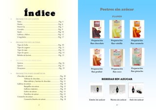 Este documento proporciona una lista de productos sin azúcar, sin gluten, sin lactosa y para diabéticos. Incluye secciones sobre flanes, cereales, mermeladas, chocolate, galletas, snacks y otros alimentos sin azúcar. También detalla opciones de leche, yogur, queso y bebidas sin lactosa, así como lácteos, quesos y desayunos sin fructosa.