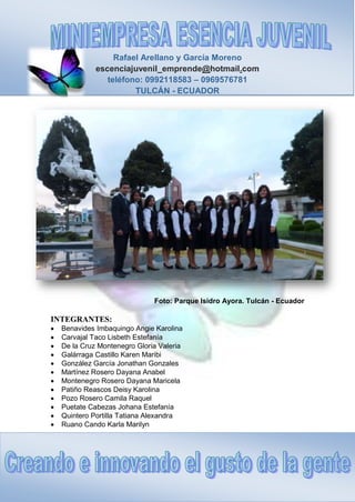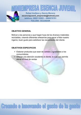 La miniempresa Esencia Juvenil está conformada por 12 estudiantes de Tulcán, Ecuador. Se dedica a la fabricación artesanal de tarjetas, cajas y fundas de regalo utilizando materiales reciclables. Su objetivo es motivar a las personas a hacer uso de materiales reciclables para crear artesanías y satisfacer las necesidades de los clientes de manera sostenible.