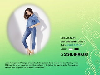 Este documento contiene descripciones y precios de varias prendas de vestir como jeans, camisas, bufandas, chaquetas, pantalones, bóxers, tenis y bermudas de diferentes marcas. Se proporcionan detalles como materiales, tallas y colores disponibles para cada producto, con precios entre $80.000 y $200.000.