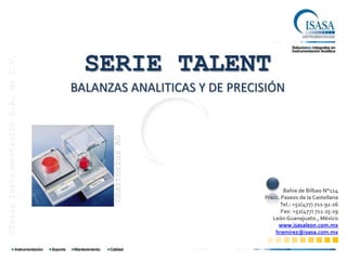 El documento describe diferentes modelos de balanzas analíticas y de precisión de las series Talent, CP, Extend, Premium SE2, ME5 y ME36S fabricadas por Sartorius AG. Incluye información sobre la capacidad, resolución y platillo de pesada de cada modelo. También destaca funciones como display de cristal líquido, interfaz RS-232, programas de aplicación y protección contra corrientes de aire.