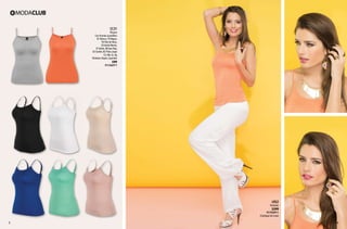 El documento detalla un catálogo de productos de moda en tendencia, incluyendo playeras, blusas, pantalones y faldas, con diversos colores, materiales y precios. Cada artículo tiene un código de producto y se ofrece en tallas específicas. Los precios varían desde $99 hasta $399, destacando la variedad de estilos disponibles.