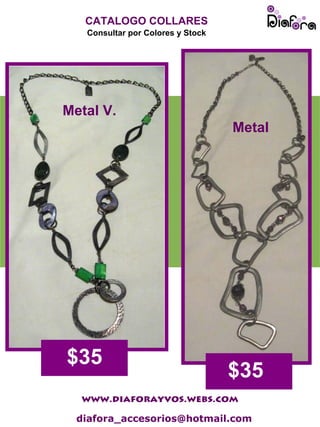 El documento presenta un catálogo de collares con los nombres y precios de seis collares diferentes, entre $35 y $45 cada uno. Incluye también la dirección web y correo electrónico de contacto de la tienda que los vende.