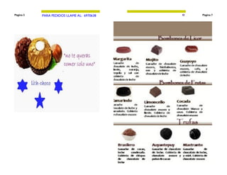 Este documento es un catálogo de productos de chocolate de la compañía Lith-choco. Presenta una variedad de chocolates como Cocuy, Grand Manier y Ponche Crema, así como su misión de vender chocolates de buena calidad. Incluye información de contacto como el número telefónico 6970638 para realizar pedidos.