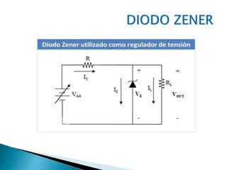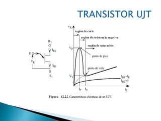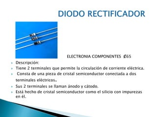 El documento proporciona descripciones y características de varios componentes electrónicos, incluyendo diodos, LEDs, diodos zener, transistores, MOSFETs, IGBTs, UJTs, temporizadores IC 555, SCRs, DIACs, TRIACs y amplificadores operacionales. Se incluyen ejemplos de circuitos para algunos de los componentes. El documento brinda información técnica detallada sobre una amplia gama de dispositivos electrónicos fundamentales.