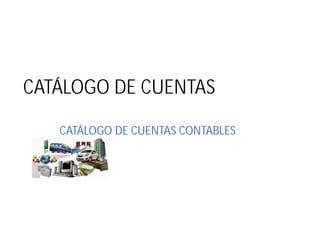 El documento presenta información sobre los catálogos de cuentas contables que deben utilizar las empresas para registrar sus transacciones financieras. Explica que un catálogo de cuentas es un documento que clasifica las cuentas en grupos como activos, pasivos, capital, ingresos, costos y gastos para ordenar los movimientos financieros de la empresa. También describe los pasos para elaborar un catálogo de cuentas e incluye un ejemplo de la estructura y codificación numérica que puede utilizarse.