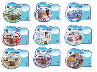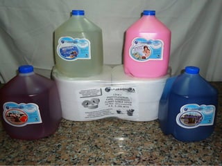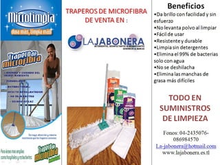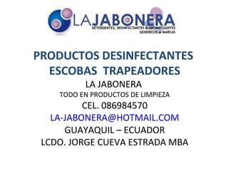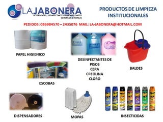 Este documento presenta el catálogo de productos de limpieza de La Jabonera, incluyendo mopas de algodón y microfibra, escobas, dispensadores de jabón y papel higiénico, y carritos de limpieza. Proporciona códigos, descripciones y precios de cada artículo. La empresa se encuentra en Guayaquil, Ecuador y ofrece productos de limpieza a granel y envasados a la venta.