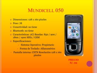 Este documento presenta el catálogo de productos de la empresa Mundicell. Incluye la descripción y especificaciones técnicas de 6 teléfonos celulares de la marca con precios entre S/. 99 y S/. 799. Los modelos varían en tamaño, peso, conectividad, cámaras, memoria y sistemas operativos.
