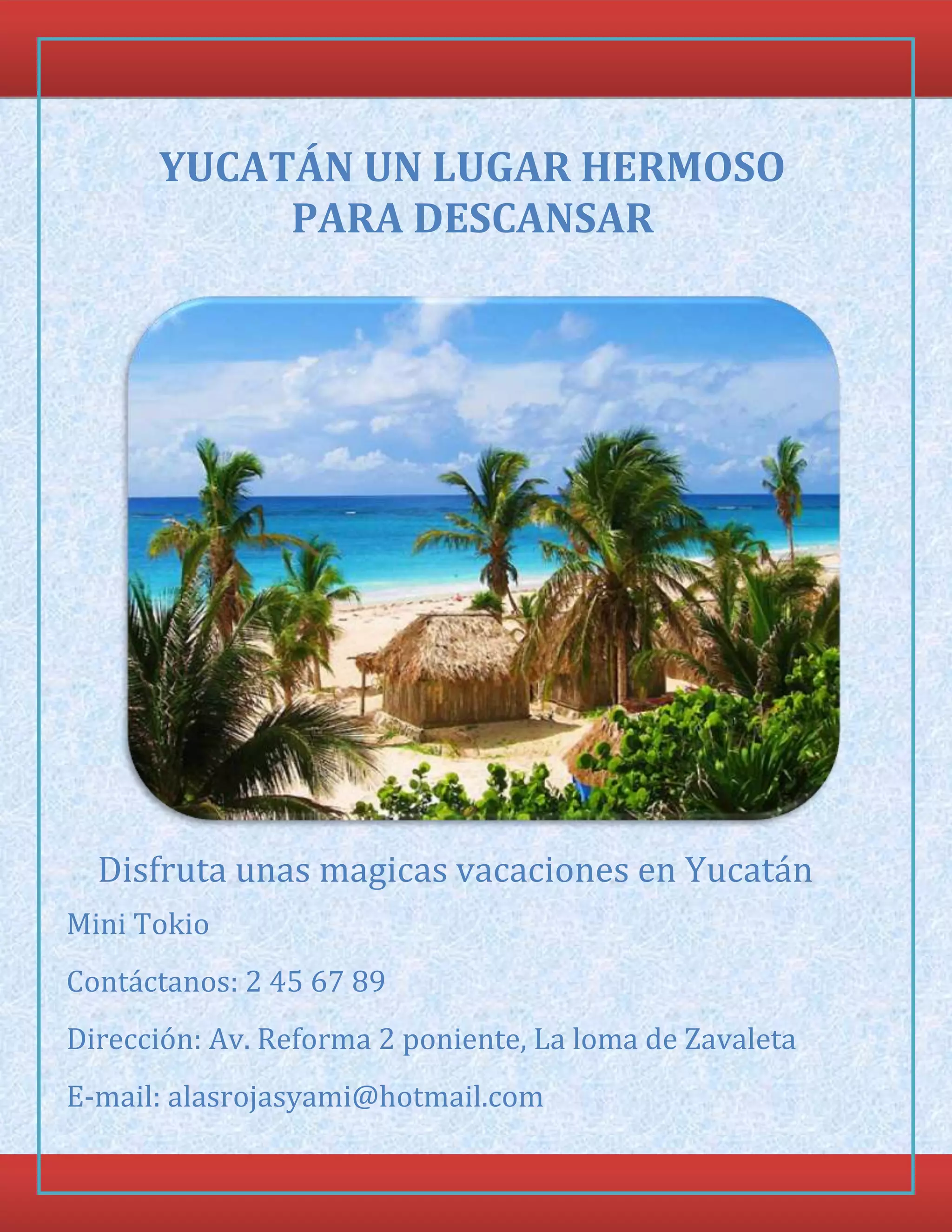 Este documento proporciona información sobre varios lugares turísticos en Yucatán, México. Presenta breves descripciones de las playas, puertos y atracciones naturales de Yucatán, incluyendo Celestún, Río Lagartos y Chichén Itzá. También promueve algunos platillos típicos de la región como huevos motuleños, panuchos y poc chuc, así como el Hotel Riviera Maya.