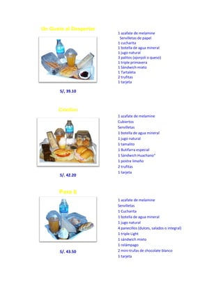 El documento presenta una variedad de ofertas de desayunos y productos alimenticios que incluyen azafates, sándwiches, jugos naturales, postres y tarjetas para distintas celebraciones, con precios que oscilan entre S/. 28.00 y S/. 121.00. Cada oferta detalla los elementos incluidos y la presentación de los mismos. La información está destinada a promocionar y facilitar la elección de opciones de desayuno para diferentes ocasiones.
