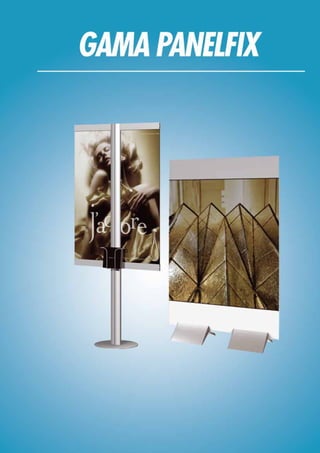 El documento presenta una amplia gama de expositores y displays, incluyendo roll-ups, pop-ups y banderas, con detalles de dimensiones y precios para cada modelo. Se destacan características como la portabilidad, la construcción en aluminio anodizado y la posibilidad de personalizar impresiones gráficas. Además, se incluyen opciones específicas para uso en interior y exterior, así como accesorios complementarios.