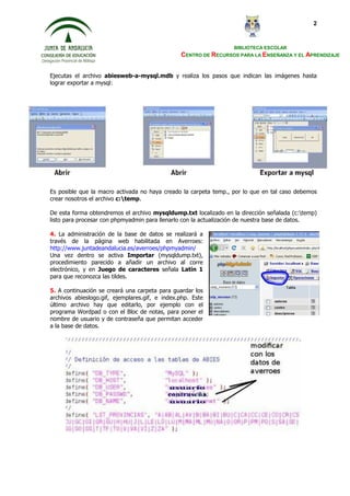 El documento describe tres procedimientos para poner el catálogo de una biblioteca escolar en línea. El primero explica cómo subir la base de datos a internet usando Abies, Microsoft Access y el servicio Averroes. El segundo procedimiento utiliza una aplicación llamada Bonsai. El tercero explica cómo usar el sitio Miarroba para publicar el catálogo en un blog sin tener una página web.