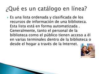 Este documento explica cómo acceder al catálogo en línea de una biblioteca. El catálogo en línea es una lista automatizada de los recursos de información de la biblioteca, accesible para el personal y el público a través de terminales en la biblioteca o en línea. El documento guía al usuario a través de los pasos para buscar en el catálogo por título, autor o materia.