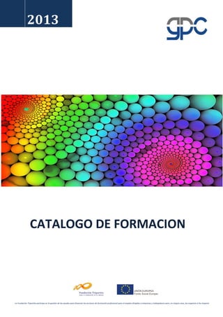 Este documento presenta un catálogo de formación para 2013 que incluye cursos de informática, diseño gráfico, alimentación, seguridad alimentaria, prevención de riesgos laborales, idiomas y más. Los cursos se ofrecen en modalidad e-learning, a distancia o presencial. También se ofrecen servicios de formación para empresas en áreas como finanzas, habilidades, ofimática y prevención de riesgos.