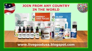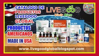 Este catálogo presenta una variedad de suplementos alimenticios y productos de cuidado personal de la marca LiveGood Global, incluyendo multivitaminas, suplementos de magnesio, proteínas, superalimentos, café, parches y productos para el cuidado de la piel, además de ofrecer paquetes de varios productos. El catálogo también proporciona breves descripciones de los beneficios a la salud alegados de cada producto.