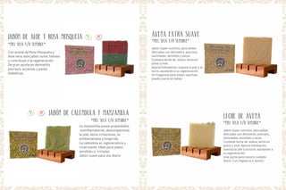 Este documento presenta los productos de una jabonería natural y cosmética botánica llamada Magic Garden. Ofrece una variedad de jabones, cremas y productos de cuidado personal elaborados con ingredientes naturales sin químicos derivados del petróleo ni conservantes dañinos. Los productos están diseñados para diferentes tipos de piel y usos como limpieza, hidratación y tratamiento de condiciones específicas.