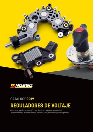 Este documento es el índice de un catálogo de productos. Proporciona una lista de cientos de códigos de productos organizados por categoría como reguladores de voltaje, plaqueteras rectificadoras, relés y destelladores. También incluye una advertencia de que la compañía no asume responsabilidad por errores en las descripciones de productos a pesar de los esfuerzos para asegurar la exactitud.