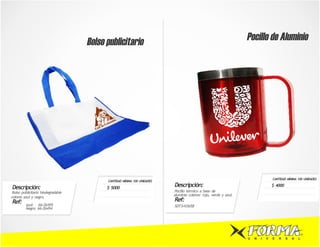 Este documento presenta una lista de varios artículos promocionales comunes que una empresa podría regalar a clientes y empleados, incluyendo bolsos, tazas, portalápices, agendas y más. Cada artículo incluye una descripción breve, precio mínimo y código de referencia. La mayoría de los artículos tienen un mínimo de pedido de 100 unidades.