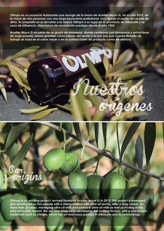 Aceites Mayo, SL produce y comercializa una amplia gama de aceites, incluyendo aceite de oliva virgen extra de las principales regiones de España. La empresa tiene líneas de envasado automatizadas para diferentes formatos y es capaz de envasar para marcas privadas. Aceites Mayo, SL se enfoca en ofrecer productos, gestión y servicio de alta calidad a través de sistemas como ISO 9001 e ISO 14001.