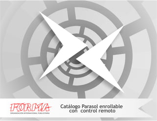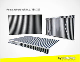 Este documento describe un parasol enrollable con control remoto, incluyendo sus especificaciones, método de instalación en 6 pasos, y consideraciones de mantenimiento. El parasol tiene una lona resistente al clima con una vida útil de 2 años, brazos extensibles y bases ajustables. Se controla mediante mando a distancia o interruptor y tiene una estructura de aluminio reforzado. El documento proporciona detalles sobre la instalación, ajuste y mantenimiento del parasol.
