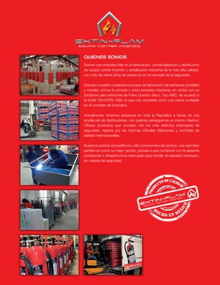 Este documento presenta un catálogo de productos de extintores de incendio fabricados por una empresa líder en México. Describe la misión, visión y política de calidad de la empresa, así como una variedad de extintores portátiles y móviles de polvo químico seco y agentes limpios para diferentes usos industriales y comerciales. Incluye especificaciones técnicas de los productos y certificaciones de calidad.