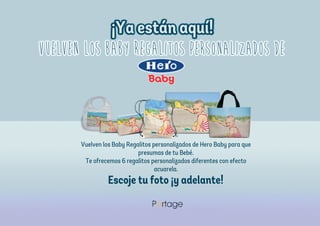Este documento presenta varios regalos personalizados para bebés y niños pequeños como baberos, neceseres, fundas y bolsos que pueden personalizarse con fotos. Incluye detalles como medidas, materiales y usos de cada artículo. También proporciona instrucciones para el proceso de personalización de los regalos con fotos.