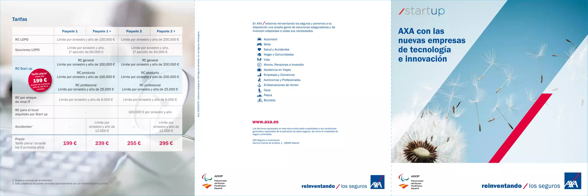 1) AXA ofrece una amplia gama de soluciones de seguros y de inversión adaptadas a las necesidades de sus clientes. 2) El seguro Start up de AXA proporciona cobertura básica para nuevas empresas desde sólo 199 euros durante los tres primeros años. 3) El seguro Start up incluye responsabilidad civil general, productos y profesional, sanciones de la LOPD, ataques de virus y accidentes.