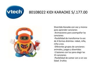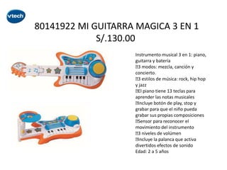 El documento presenta una lista de juguetes educativos para niños de diferentes edades, con sus características y precios. Los juguetes incluyen karaoke, instrumentos musicales, juegos de piloto, aeropuerto, zona de obras, proyectores, sonajeros, manzanas, panderetas y más, diseñados para enseñar sobre música, números, colores, partes del cuerpo y estimular el desarrollo.