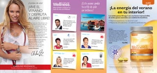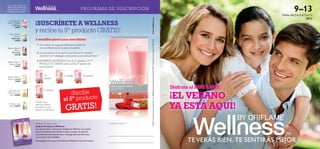 Este documento describe un programa de suscripción de Wellness que ofrece productos como batidos, sopas y suplementos para niños. Los clientes pueden suscribirse en 3 pasos y recibirán regalos con sus segundo y quinto pedidos. El programa incluye productos como batidos de fresa, vainilla y chocolate, sopas de tomate y espárragos, y suplementos vitamínicos y de omega 3 para niños, que proporcionan una nutrición completa y ayudan a perder peso de forma saludable.