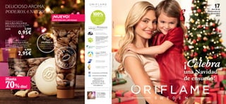 Oriflame presenta una variedad de productos de belleza y cuidado personal en su catálogo 17 de 2012, incluyendo jabones, cremas y fragancias, todos con una garantía de satisfacción del 100%. La compañía enfatiza su compromiso con la no experimentación en animales y apoya iniciativas sociales. Además, ofrece descuentos y promociones especiales por las festividades navideñas, así como ideas de regalos para la temporada.