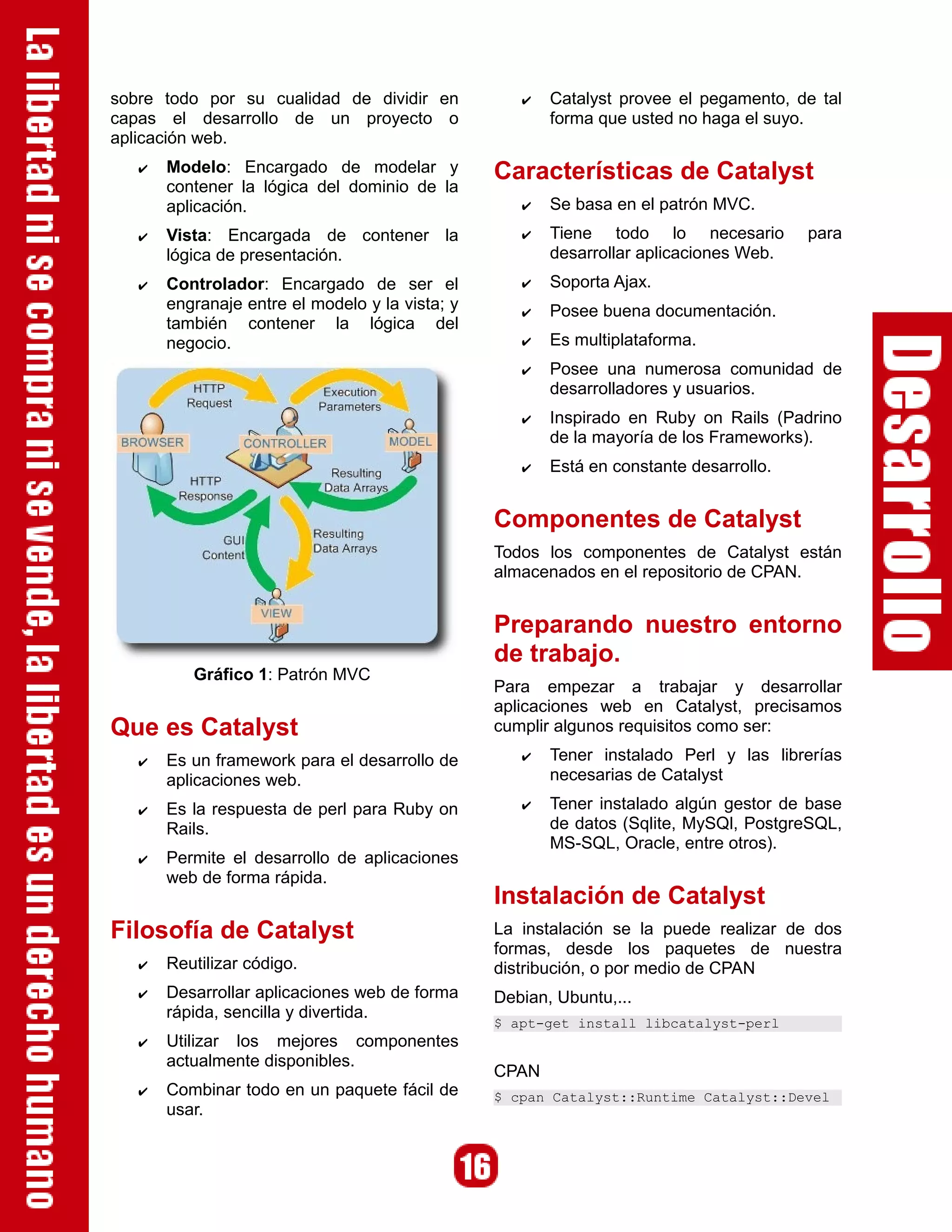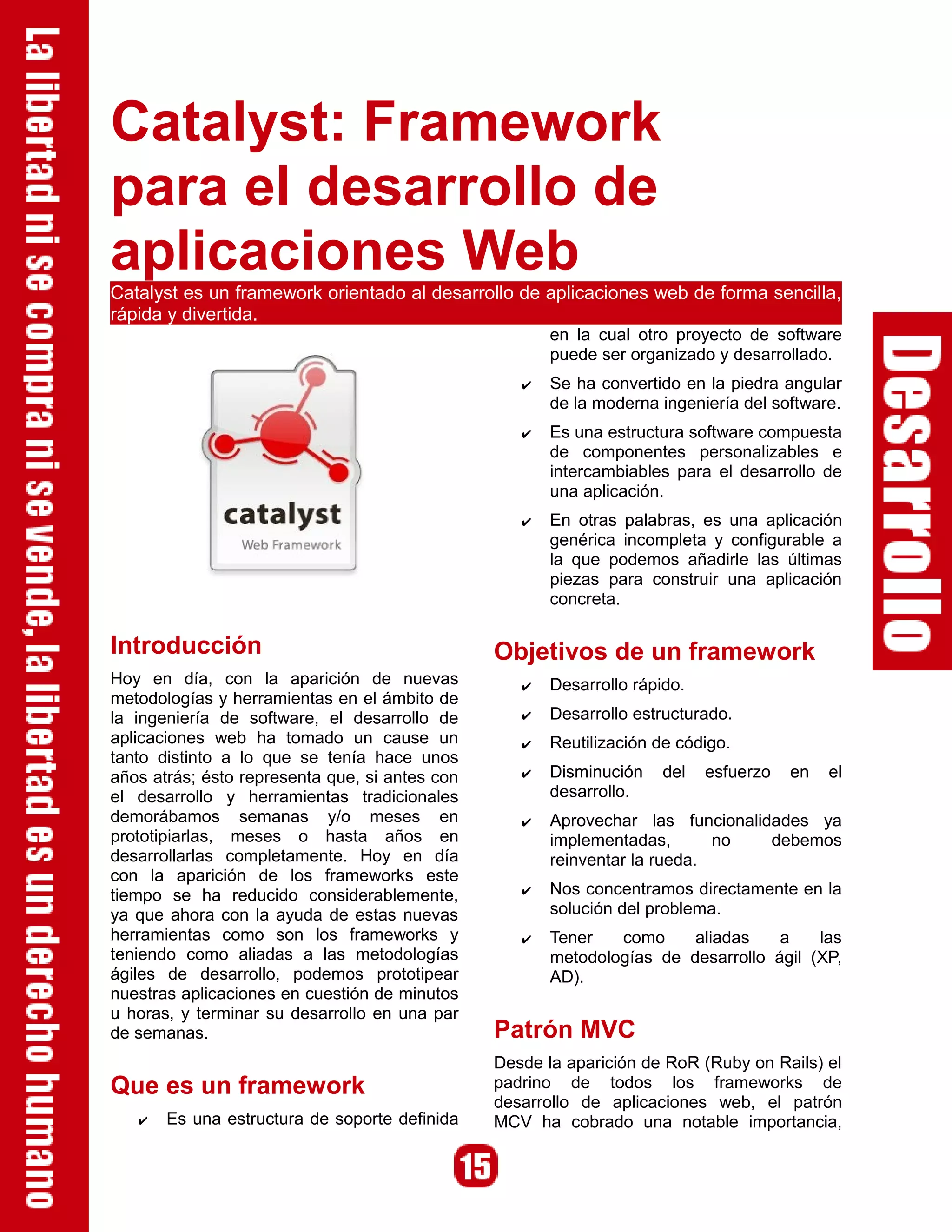 El documento describe el framework Catalyst para el desarrollo de aplicaciones web en Perl. Catalyst permite crear aplicaciones web de forma rápida y sencilla siguiendo el patrón MVC. El documento explica cómo crear un proyecto en Catalyst, generar modelos, vistas y controladores, e implementar la lógica de una aplicación para gestionar eventos con expositores y conferencias.