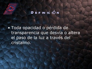 La catarata es una opacidad del cristalino que causa pérdida de transparencia y desvía la luz, siendo la causa número 1 de ceguera reversible. Se ha descrito desde el siglo X, clasificándose anatómicamente en cortical, nuclear, subcapsular y mixta, y etiológicamente en senil, congénita, traumática, asociada a enfermedades oculares y sistémicas, o por agentes nocivos. Su diagnóstico incluye exámenes visuales, de lámpara de hendidura