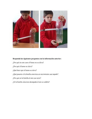 El documento describe un experimento para demostrar que el humo no siempre se eleva. Explica que dentro de una botella cerrada, el humo caerá hacia abajo en forma recta debido a la falta de oxígeno y turbulencias del aire. La hipótesis es que al no haber oxígeno dentro de la botella, el humo se dirige hacia abajo por gravedad.