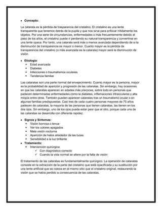 Este documento proporciona información sobre las cataratas. Define las cataratas como la pérdida de transparencia del cristalino del ojo, lo que causa visión borrosa. Explica que las causas más comunes son la edad, la diabetes y los antecedentes familiares. Los síntomas incluyen visión borrosa, halos alrededor de las luces y sensibilidad a la luz. El tratamiento es quirúrgico mediante la extracción del cristalino opaco y su reemplazo con una lente artificial.